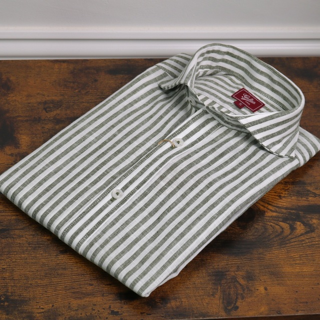Camisa de rayas barras verdes y blancas, composición 70% algodón y 30% lino. Cuello cutaway sin botón, no lleva bolsillo. Fabricada en Italia.