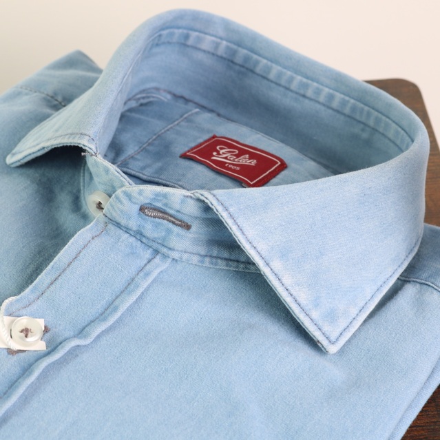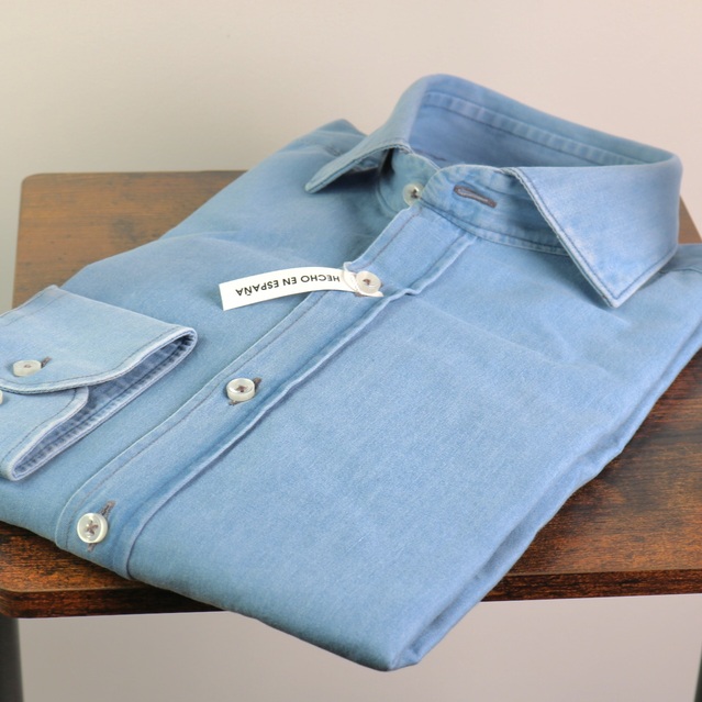 Camisa 100% algodón, tipo vaquera, tejido fino y suave. Cuello cutaway sin botón. No lleva bolsillo. Fabricada en España