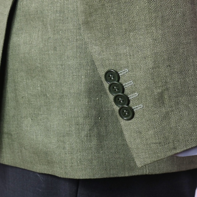 Americana 100% lino, con espigas, de color verde. Patrón clásico ,dos botones y dos aberturas trasera. Tiene dos bolsillos con tapetas.