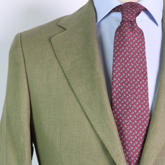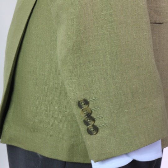 Chaqueta 100% lino, color verde claro. Patrón clásico con dos botones y dos aberturas. Lleva medio forro y bolsillos con tapetas.