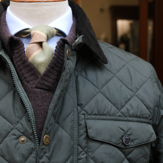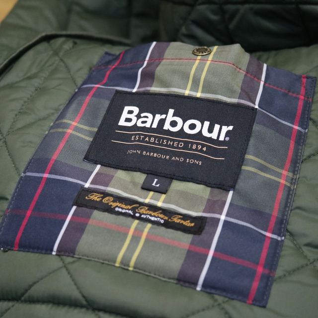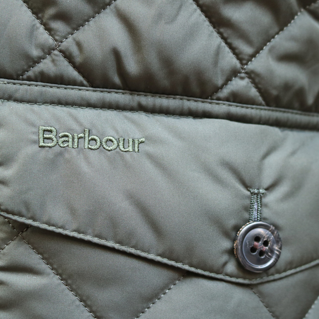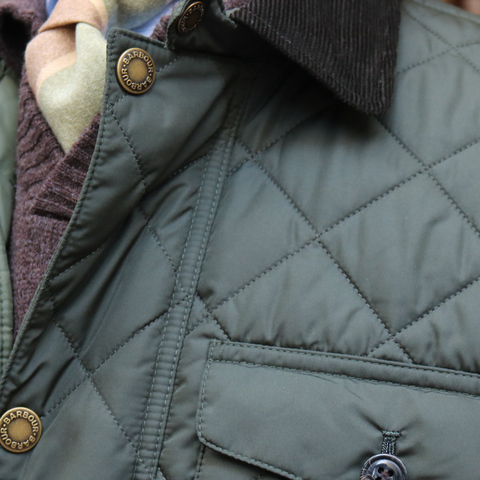 Chaquetón acolcchado de la firma Barbour. Color verde. Tiene dos bolsillos inferiores con tapeta y otro superior en el pecho. Dos bolsillos laterales para manos. Cuello de pana. Espalda sin aberturas. Bolsillo interior inferior con el casracterístico tartan.