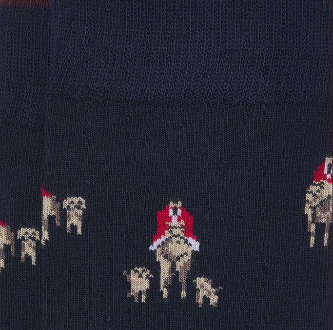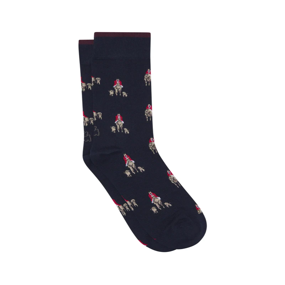Calcetines de media caña con estampado de cacería a caballo sobre fondo azul marino. Fabricados en España con materiales premium, estos calcetines ofrecen un ajuste óptimo gracias a su talla única, adaptándose perfectamente al pie sin apretar ni perder forma. Puntera y talón en colores combinados para un acabado duradero y distintivo.