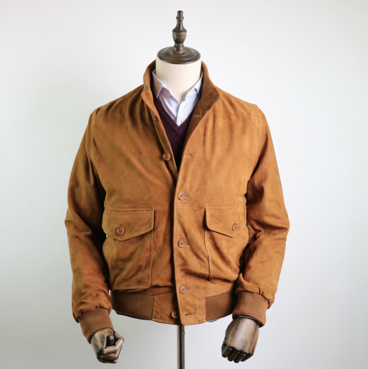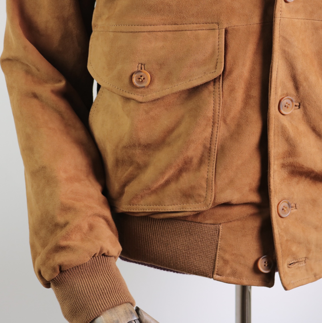 Cazadora de piel con cuello chimenea, lleva punto en los puños, dos bolsillos inferiores con tapeta y botones de pasta.