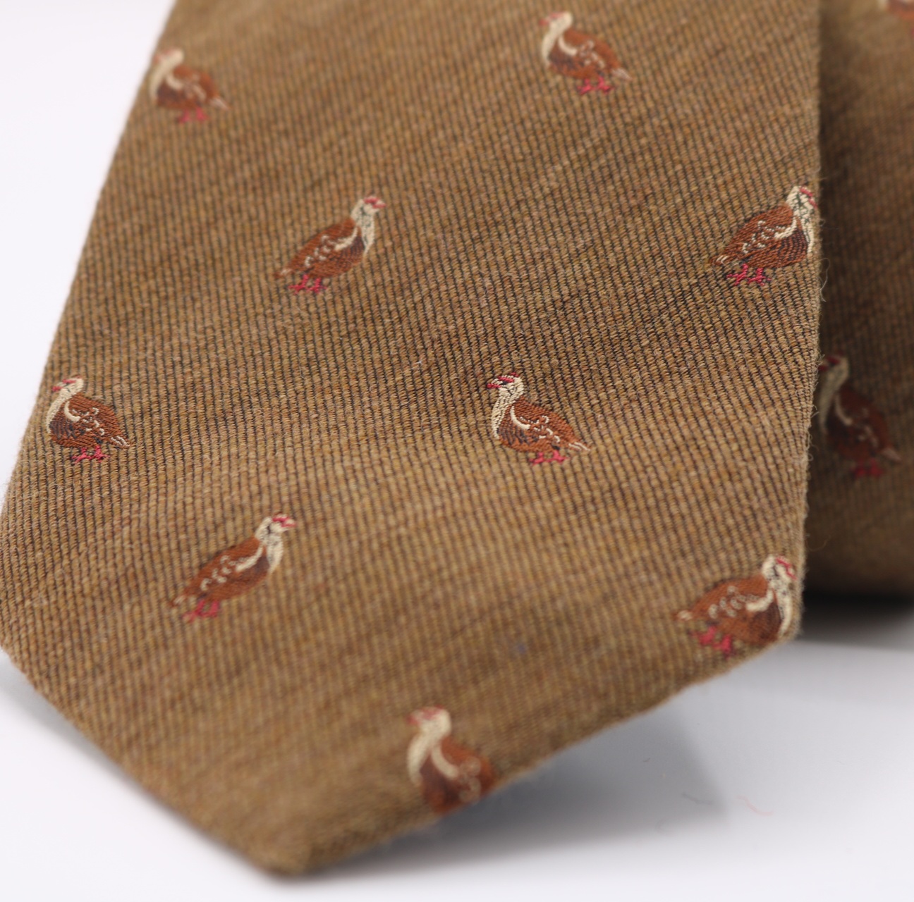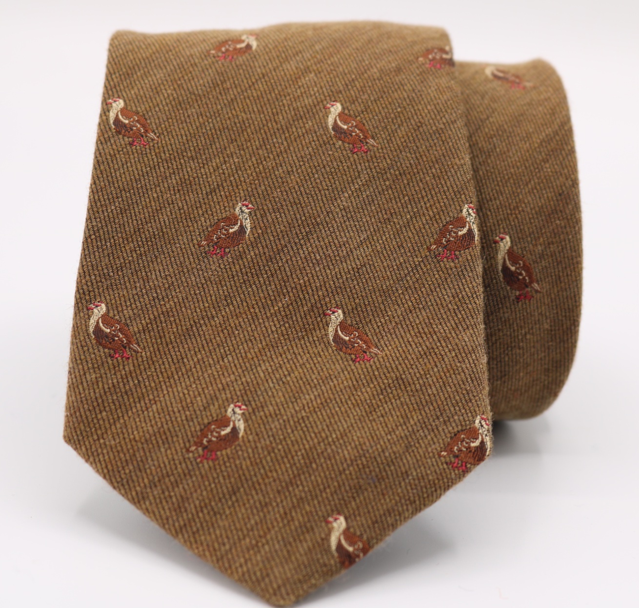 Corbata 100% lana. Fondo marrón con perdices. Fabricada en Italia. Pala 8 cm