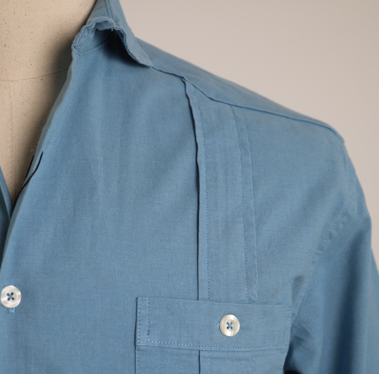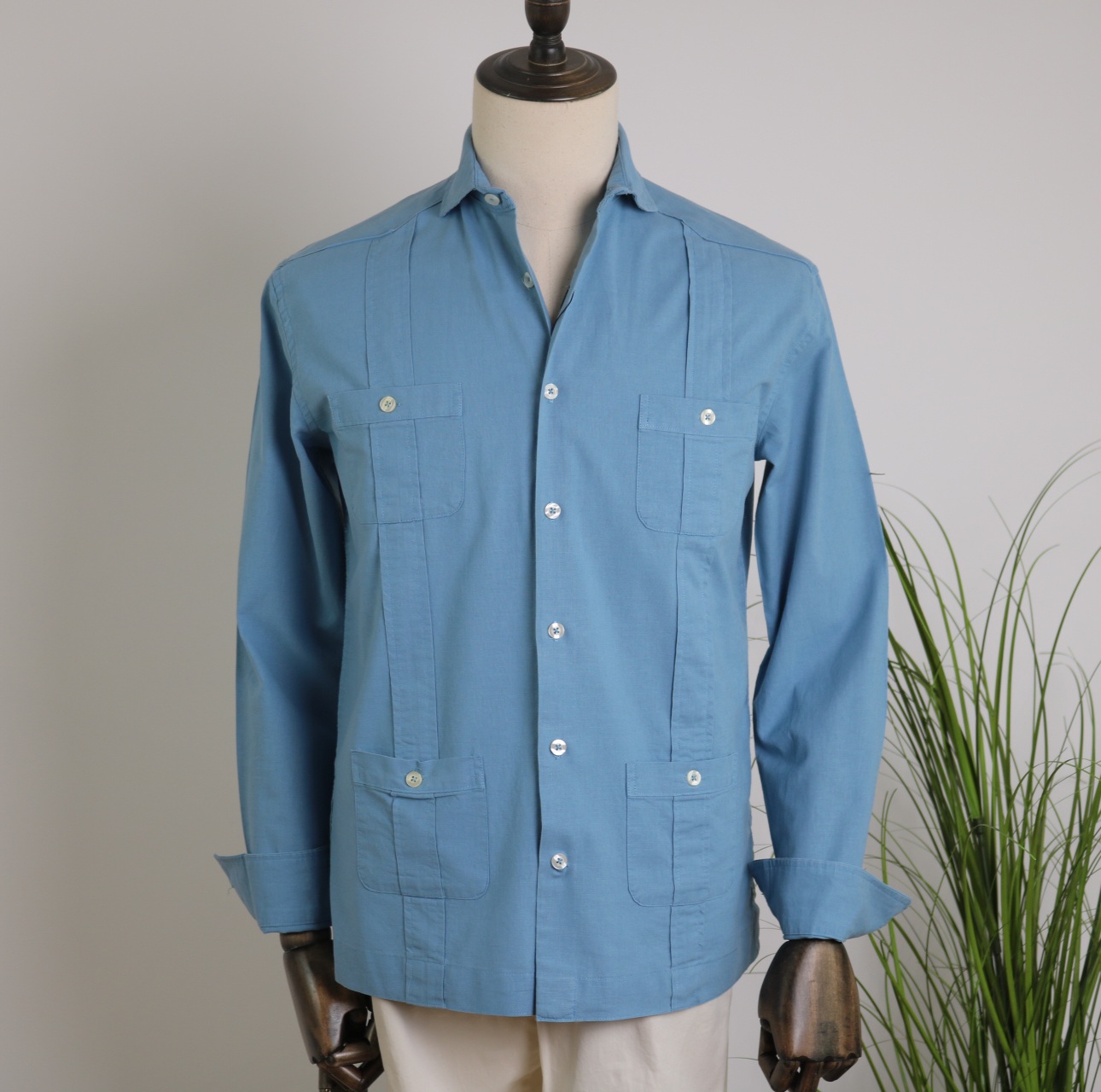 Camisa guayabera color azulón. Composición 60% algodón y 40% lino. Lleva cuatro bolsillos delanteros con tablones, y tres tablones en la espalda. Cuello cutaway sin botón.