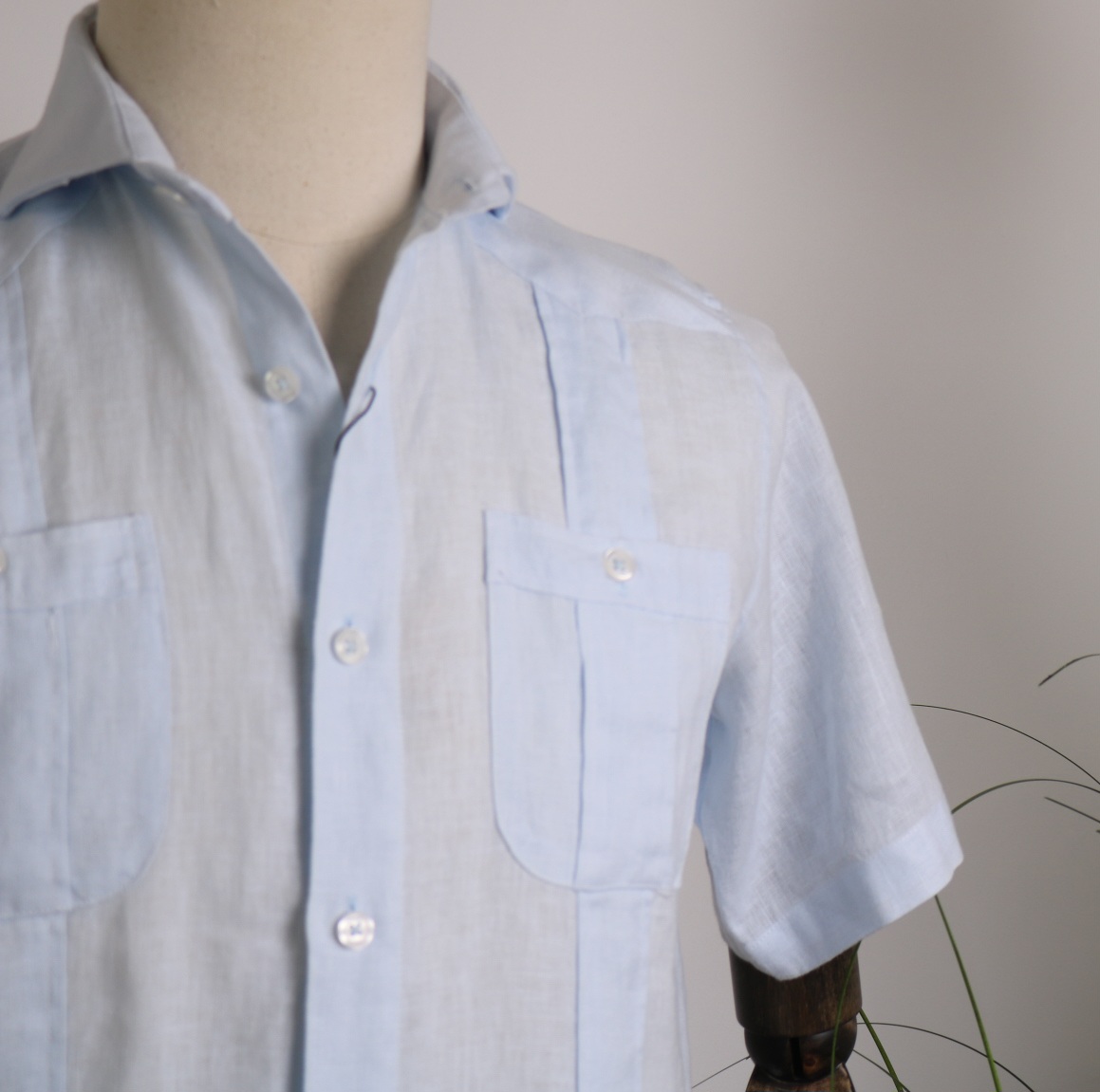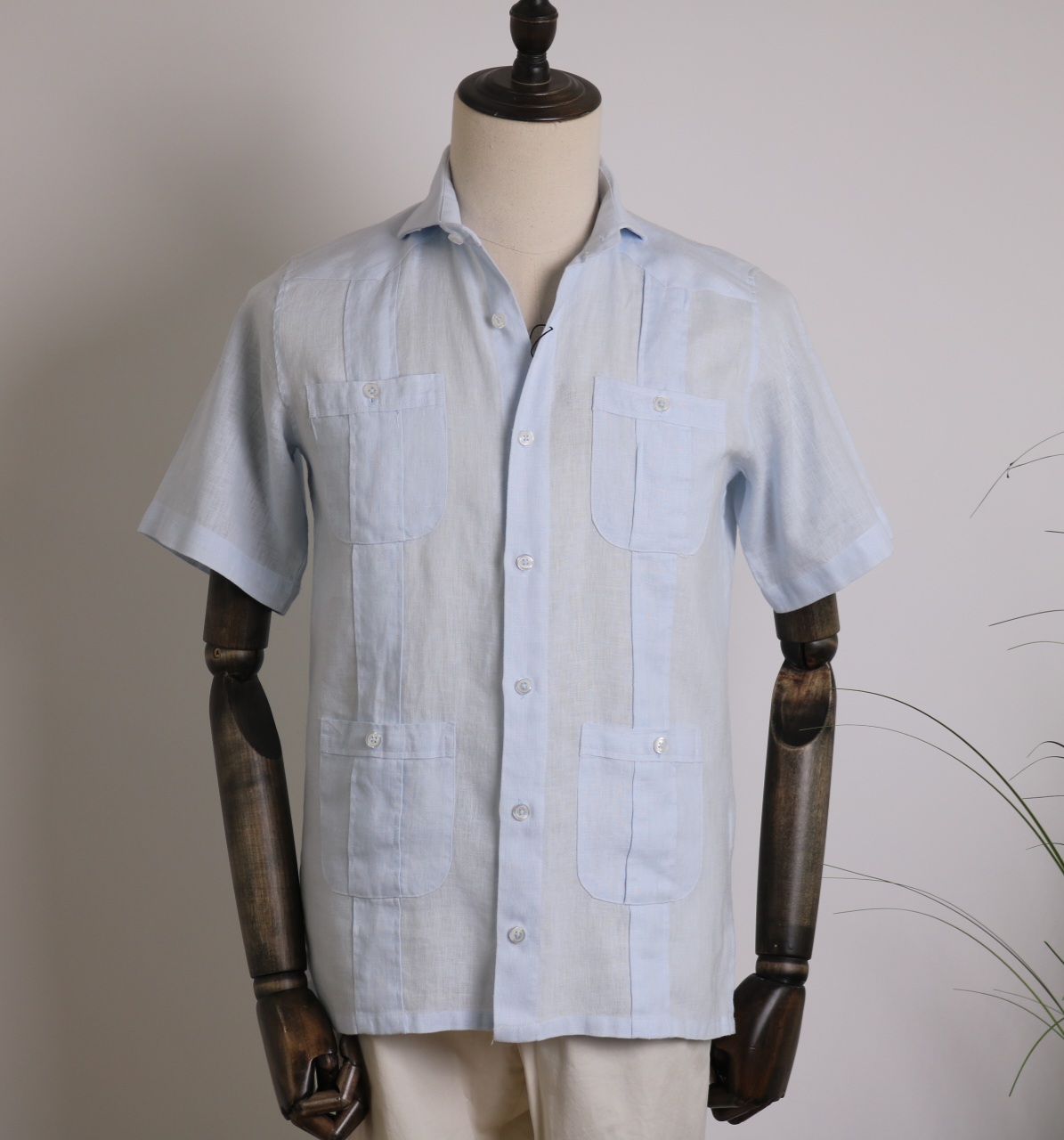 Camisa guayabera manga corta color celeste. Composición 100% lino. Lleva cuatro bolsillos delanteros con tablones, y dos tablones en la espalda. Cuello cutaway sin botón.