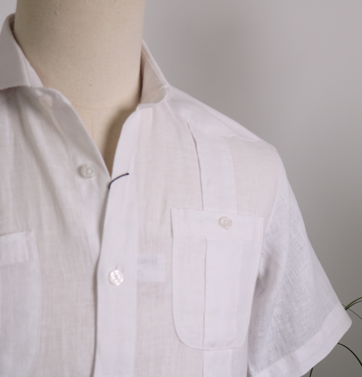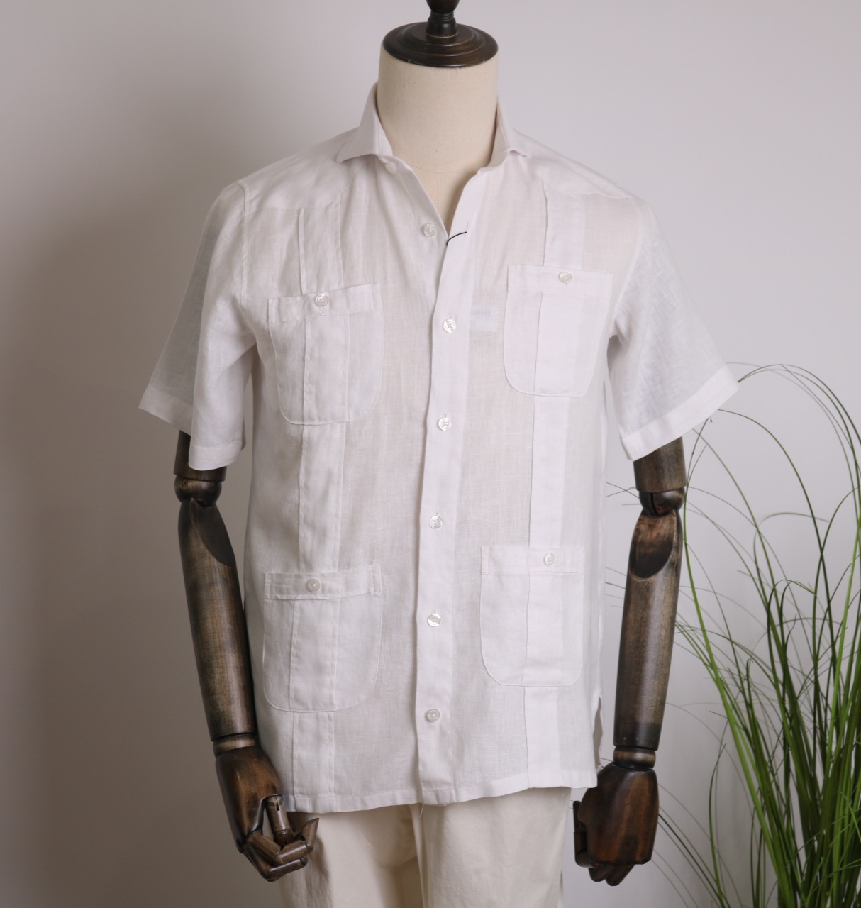 Camisa guayabera manga corta color blanco. Composición 100% lino. Lleva cuatro bolsillos delanteros con tablones, y dos tablones en la espalda. Cuello cutaway sin botón.