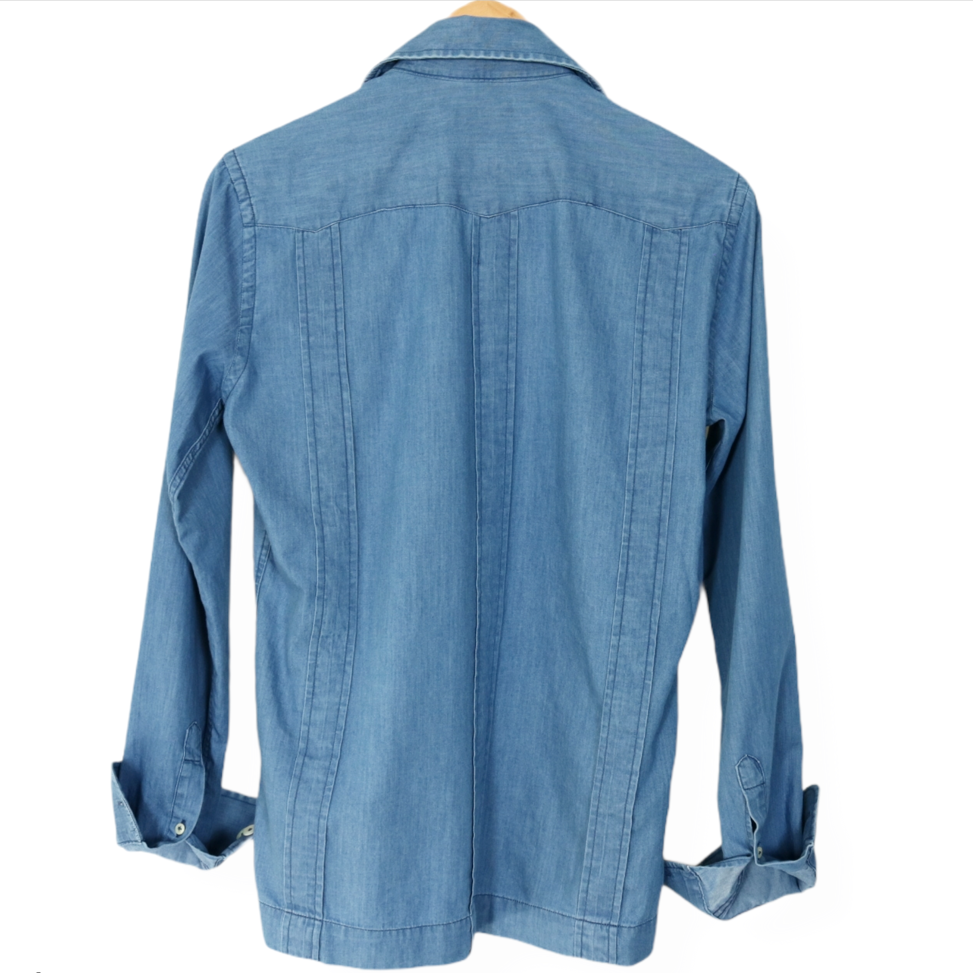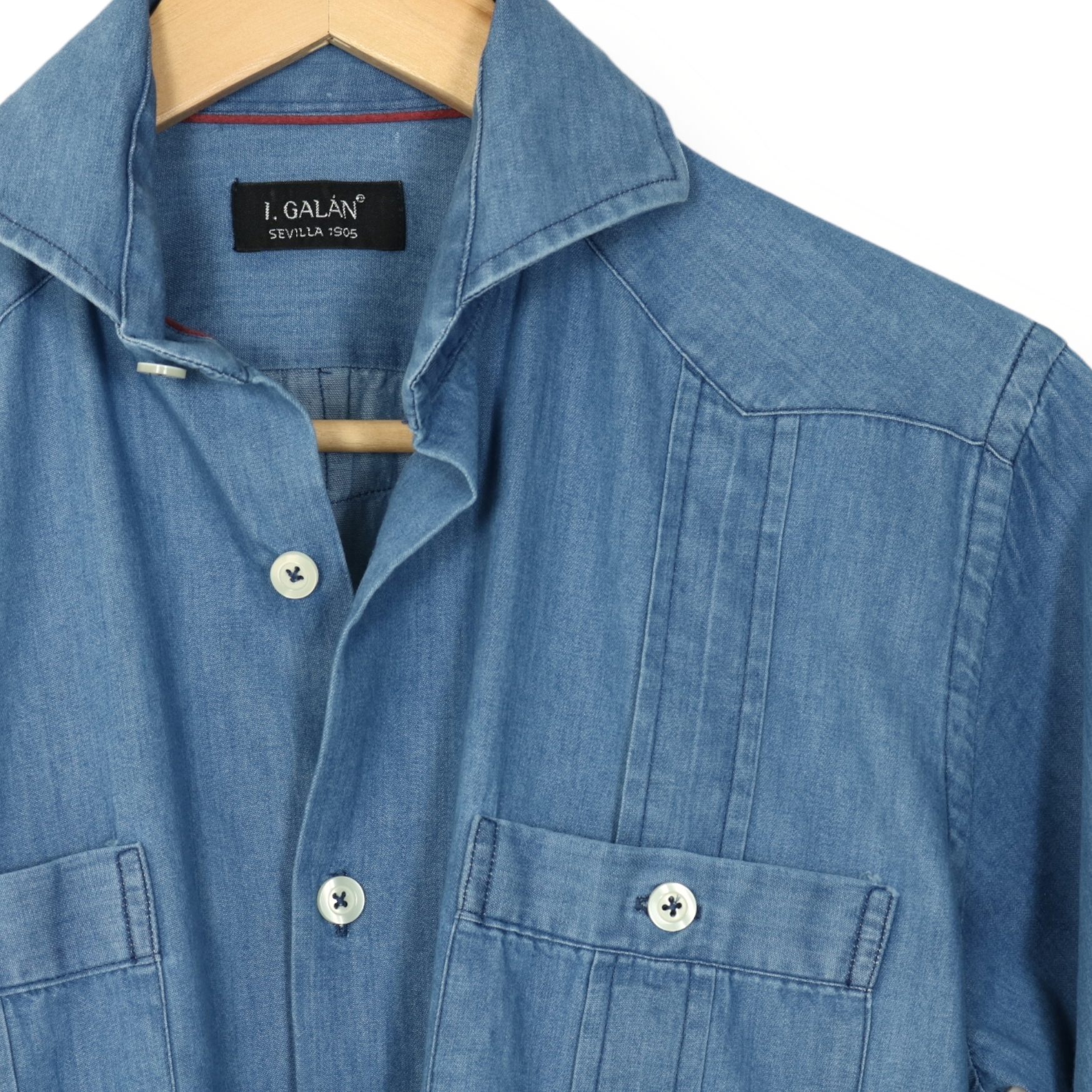 Guayabera tejido denim. 100% algodón.. Lleva 4 bolsillos delanteros con dos tablones, y tres tablones en la espalda. Fabricado en España.